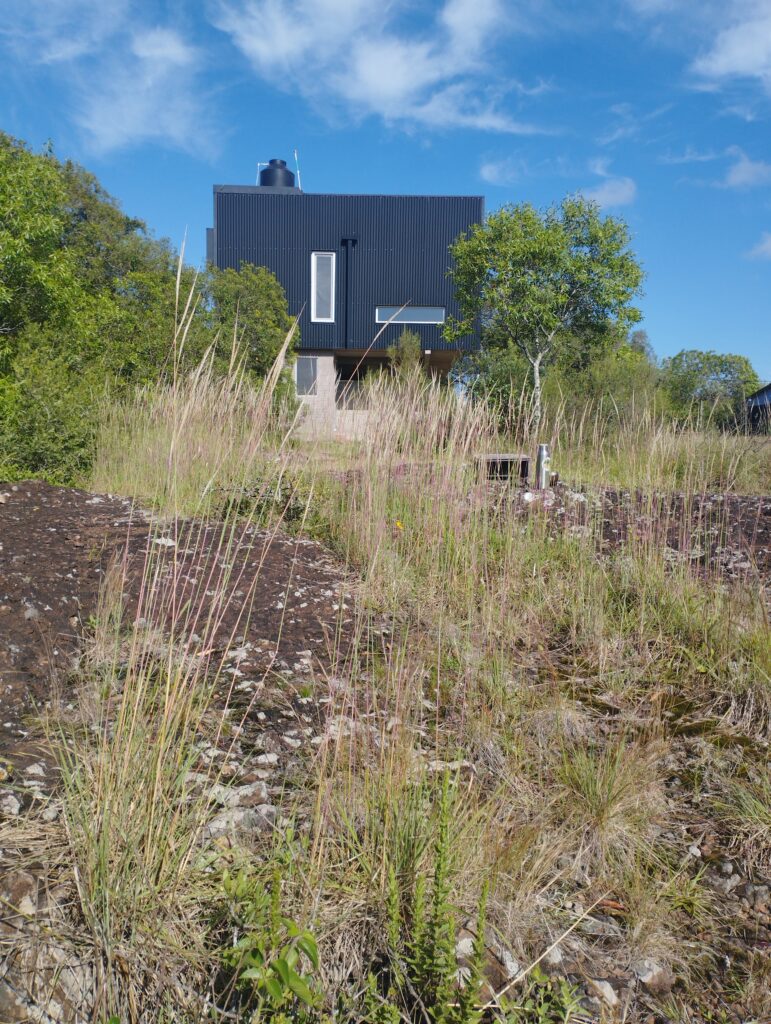 Estrutura mista – segundo pavimento – sistema plataforma madeira e pilar+viga madeira – Vedações com membrana chapa OSB +membrana antivapor + parede ventilada em frontal madeira de eucalipto e chapa ondulada de aluzinco pre pintada preto fosco.