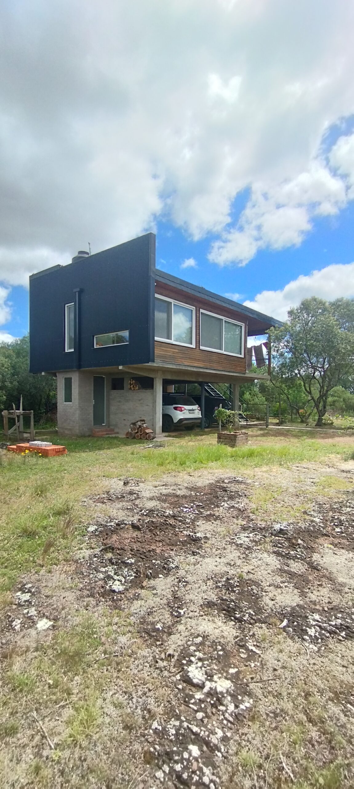 Estrutura mista – segundo pavimento – sistema plataforma madeira e pilar+viga madeira – Vedações com membrana chapa OSB +membrana antivapor + parede ventilada em frontal madeira de eucalipto e chapa ondulada de aluzinco pre pintada preto fosco.